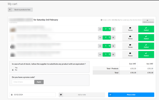 - Click on "Place Order".You will be taken to a page where you can add a note for each product, as well as a general note for the order. You can also select the order date, and if you have a promotional code, you can add it here.